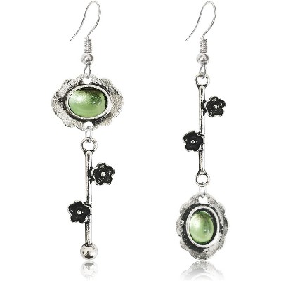 Handmade Bohemian Plum Blossom Dangle Earrings - Silver Asymmetry Drop with Green Crystal, Mother's Day Jewelry Gift
