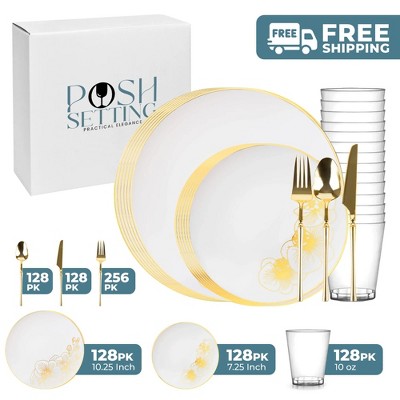 Posh Setting 420 Piece White And Gold Plastic Party Bundle - Peony (60 Settings)