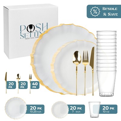 Posh Setting 140 Piece White And Gold Plastic Party Bundle - Organic (20 Settings)