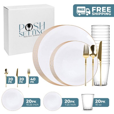 Posh Setting 840 Piece Transparent White And Gold Plastic Party Bundle - Luxe (120 Settings)