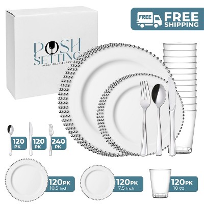 Posh Setting 420 Piece White And Silver Plastic Party Bundle - Luxe (60 Settings)