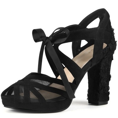 BLISSFUL STEP Lace Flowers Platform Peep Toe Chunky High Heel Sandals for Women