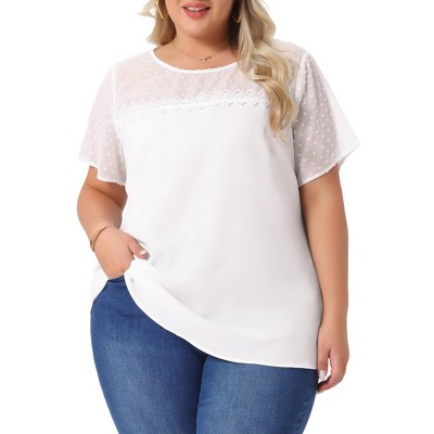 Agnes Orinda Women's Plus Size Contrast Panel Polka Dots Mesh Crew Neck Short Sleeve Casual Blouses