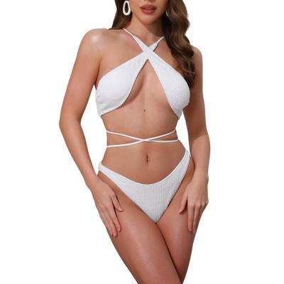 Anna-Kaci Women's Three-Piece Lace Swimsuit Set with Long Sleeve Crop Top Triangle Bikini and Ruched Mini Skirt Cover-Up - Small, White