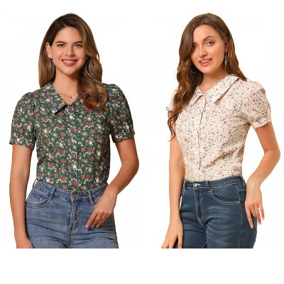 INSPIRE CHIC Women's Puff Short Sleeves Point Collar Button Down Floral Shirts 2 Packs