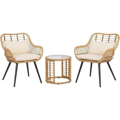 SUGOLD 3-Piece Patio Bistro Set, Wicker Outdoor Furniture with Cushioned Chairs & Round Glass Coffee Table