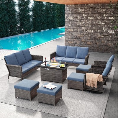 Brafab 9 Peices Outdoor Patio Furniture Set with 44" Gas Fire Pit Table and Swivel Rocking Chairs Conversation Sets with 4.3" Cushion