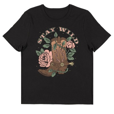 Vintage Country Boots and Roses Stay Wild Women's Black Short Sleeve Crew Neck Tee