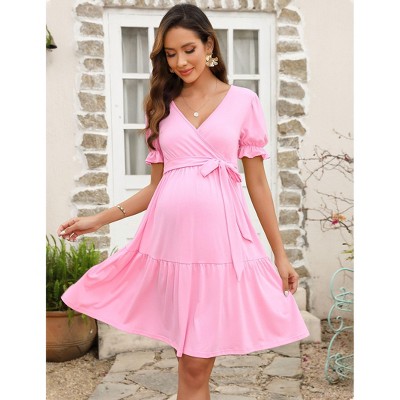 Coolmee Women's Maternity Dress Puff Short Sleeves V Neck Dresses Casual High Waist A Line Solid Color Midi Dress with Belt
