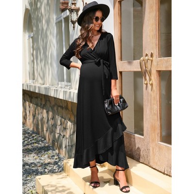 Coolmee Women's Maternity Dress V neck 3/4 Sleeve Ruffle Long Dress High Waist A Line Maxi Dress with Belts