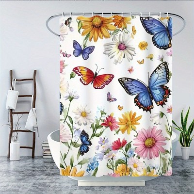 Lomsoe 4PCS Vibrant Butterfly & Wildflower Shower Curtain Set, Bold Colorful Print, Water-Repellent Curtain with Absorbent Mats