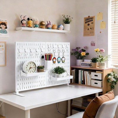 Portable Tabletop Peg Board Display Stand with 10 Hooks&2 Trays,Assembles easily,Freestanding Plastic Pegboard for Vendor Office Home Dorm Apartment