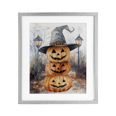 Stupell Industries Stacked Jack-o-Lanterns with Witch Hat Floating Frame Canvas Art, Brown, 17" x 21"
