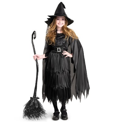 Joyfy Girls' Witch Costume Halloween, Gothic Sorceress Black Witch Dress with Broom and Hat for Girls Halloween Themed Parties