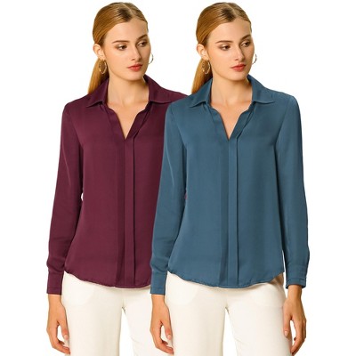 INSPIRE CHIC Women's Elegant V Neck Long Sleeve Office Work Satin Shirt 2 Packs