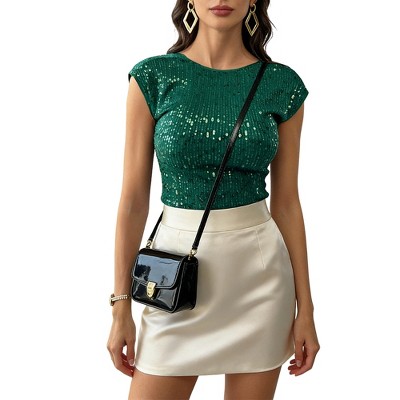 Women's Sequin Embellished Cap Sleeve Crop Top with Low Back, Glittery Form-Fitting Blouse for Party & Night Out Wear