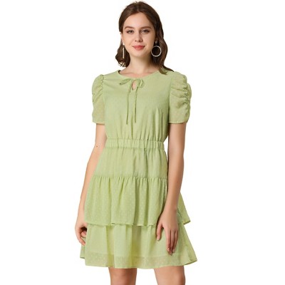 Allegra K Women's Swiss Dots Ruched Short Sleeve Elastic Waist Layer Ruffle Hem Dress