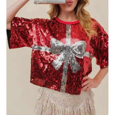 Anna-Kaci Glitter Sequin Tops Short Sleeve Sparkly Binding Shirt Blouse- X Large ,Red