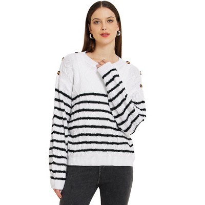 INSPIRE CHIC Women's Striped Pullover Crewneck Long Sleeve Cable Knitted Sweater