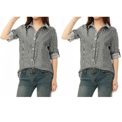 Allegra K Women's Striped Button Down Roll-up Long Sleeves Point Collar Shirt 2 Packs
