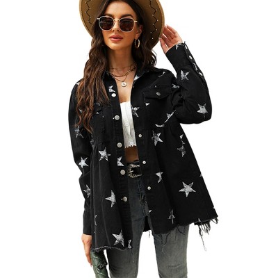 Coolmee Women's Oversized Distressed Jean Jacket Button Down Long Sleeve Star Print Loose Fit Denim Trucker Jean Coats