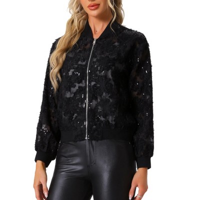 INSPIRE CHIC Women'sSequin Long Sleeve Zipper Sparkly Party Bomber Jacket