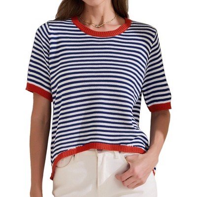 INSPIRE CHIC Women's Summer Striped Knitted Short Sleeve Trendy Loose Fit Pullover T-Shirt