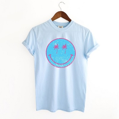 Simply Sage Market Women's Blue Smiley Palm Trees Short Sleeve Garment Dyed Tee - S - Chambray
