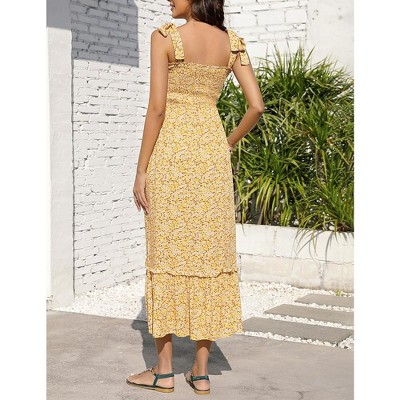 Allegra K Women's Summer Boho Smocked Spaghetti Strap Tie Waist Ruffle Beach Dress