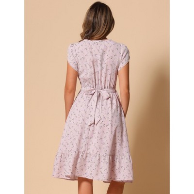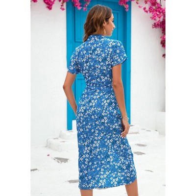 Allegra K Women's Boho Flutter Sleeve V Neck Belted A-Line Wrap Midi Floral Dress