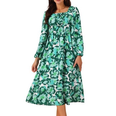 Seta T Women's Boho Square Neck Long Sleeve Floral Flowy Midi Casual Vacation Dress