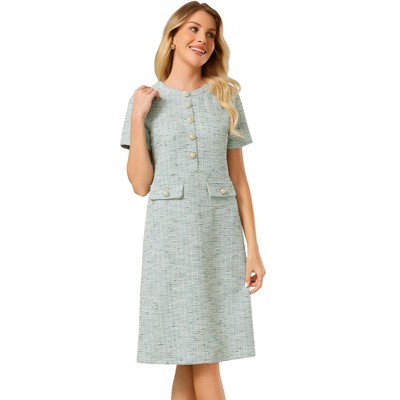 INSPIRE CHIC Women's Crew Neck Short Sleeve Tweed Button Decor Elegant Work Sheath Midi Dress