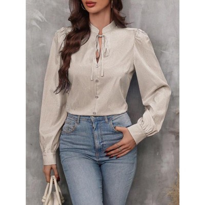 Women's V-Neck Tie Detail Striped Shirt - Long Sleeve Button Down Blouse for Office & Casual