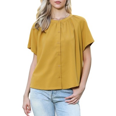 INSPIRE CHIC Women's Ruched Crew Neck Button Down Short Sleeve Casual Summer Blouses