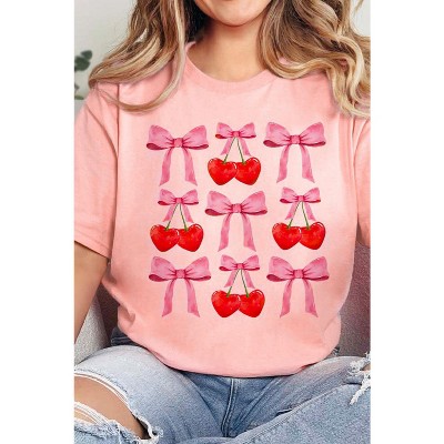 Pink Bow Cherry Print Crew Neck Casual T Shirt