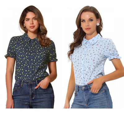 INSPIRE CHIC Women's Plaid Gingham Puff Sleeve Ruffle Peter Pan Collar Shirt