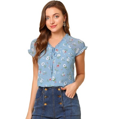 Allegra K Women's Floral Embroidered Shirt Pleated Round Neck Ruffle Peasant Top