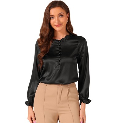 Allegra K Women's Ruffle Neck Long Sleeve Elastic Cuff Button Office Satin Blouse