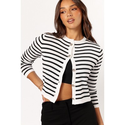 Anna-Kaci Women's Striped Button Front Knit Cardigan with Contrast Trim and Long Sleeves - Small, White