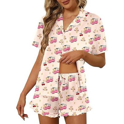 Ekouaer Pajamas Set for Women Short Sleeve Sleepwear Button Down Pjs Lounge Sets Soft Nightwear Teddy Bear-Pink Cherry M