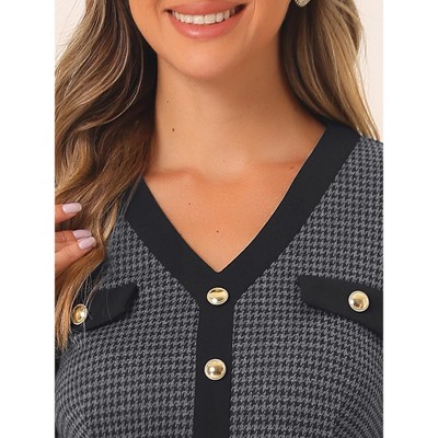 Allegra K Women's Houndstooth V Neck Long Sleeves Elegant Sheath Dresses