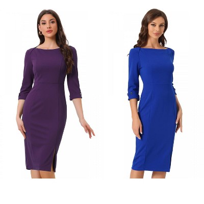 INSPIRE CHIC Women's Elegant Boat Neck 3/4 Sleeves Work Midi Split Sheath Dress 2 Packs