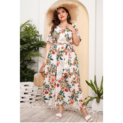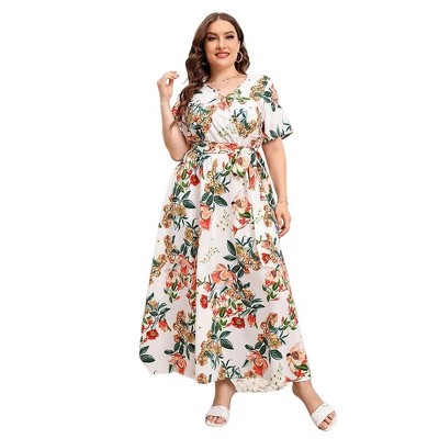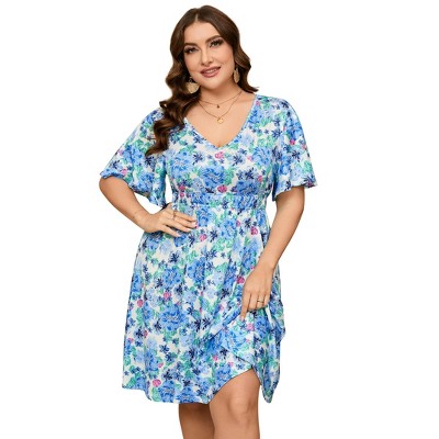 Agnes Orinda Women's Plus Size Summer Boho Casual V Neck Short Sleeve Floral Print Beach Midi A Line Dress
