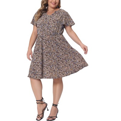 Agnes Orinda Women's Plus Size Notched V Neck Ruffle Sleeve A Line Floral Boho Midi Dresses
