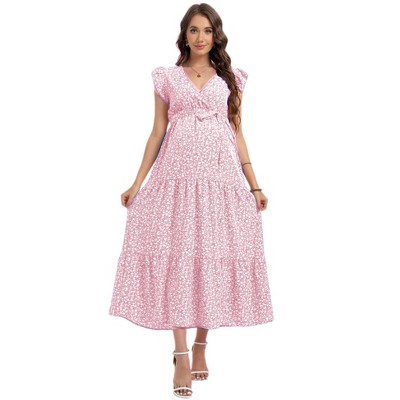 Women Bohemian Floral Casual Wrap Ruffle Belt A-Line Pleated Hem Midi Sun Dress