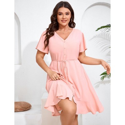 Plus Size Casual V Neck Dress for Women Loose Swing Ruffle Summer Boho Midi Dress with Pockets