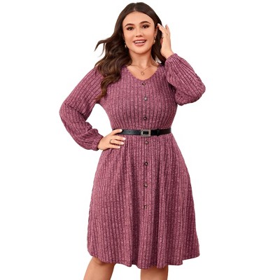 Clearlove Plus Size Women's V Neck Lantern Sleeve Button Sweater Dress with Belt