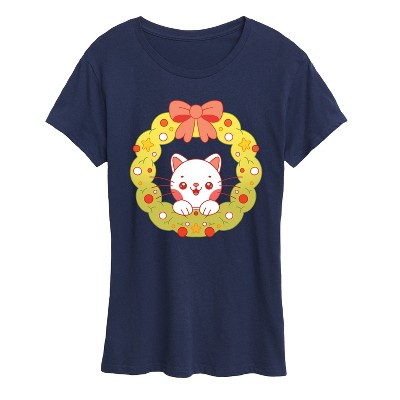 Women's - Instant Message - Chibi Cat Christmas Wreath Short Sleeve Graphic T-Shirt