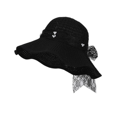 Anna-Kaci Women's Wide Brim Straw Sun Hat with Lace Bow Ribbon Pearl Decoration Summer Beach Sun Protection Floppy Hat