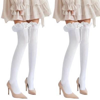 Anna-Kaci 2pcs Women's Over-the-Knee Tights with Ruffled Trim and Satin Ribbon Bow Detail - White